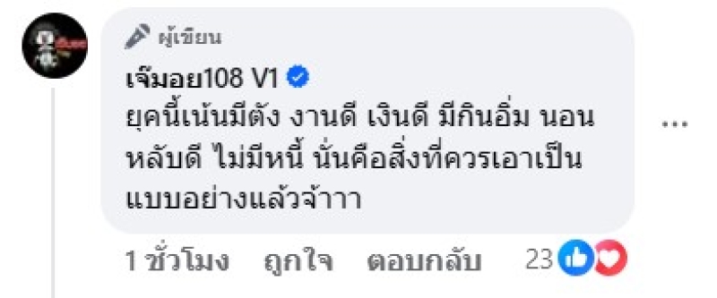 และทางเพจดัง ยังคอมเมนต์ใต้โพสต์เพิ่มว่า ยุคนี้เน้นมีตัง งานดี เงินดี มีกินอิ่ม นอนหลับดี ไม่มีหนี้ นั่นคือสิ่งที่ควรเอาเป็นแบบอย่างแล้วจ้าาา