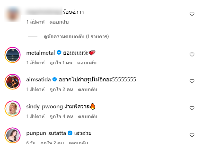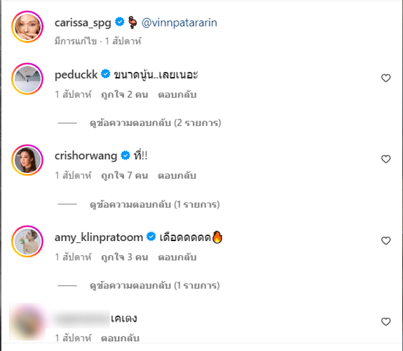 งานนี้ เหล่าเพื่อนๆในวงการ และแฟนคลับ ก็เข้ามาคอมเมนต์กันจำนวนมาก อาทิ เดือดดดดด,ยอมมมมว่ะ,เอวววววโพก,สวยมากกกกกกกก,แซ่บไฟลุกเลยครับพี่คาริสา,โคตรชอบหุ่น เป็นต้น