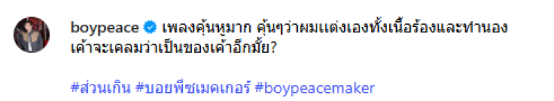 พร้อมแคปชั่นแบบฟาดนิ่มๆ ว่า เพลงคุ้นหูมาก คุ้นๆ ว่าผมเเต่งเองทั้งเนื้อร้องและทำนอง เค้าจะเคลมว่าเป็นของเค้าอีกมั้ย #ส่วนเกิน #บอยพีซเมคเกอร์ #boypeacemaker