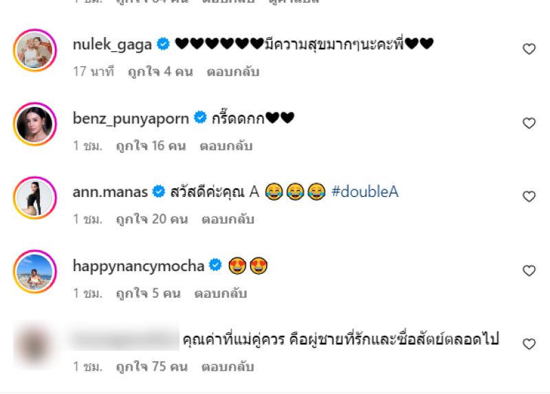 งานนี้ เหล่าเพื่อนๆในวงการและแฟนคลัลเข้ามาแสดงความคิดเห็นกันจำนวนมาก อาทิ เบิกบานใจมากแม่,อุ้ยย เหมือนจำข้างหลังได้,คุณค่าที่แม่คู่ควร คือผู่ชายที่รักและซื่อสัตย์ตลอดไป,สวัสดีค่ะคุณ A,งู้ยยยย แม่ น่ารักสุดๆ เป็นต้น