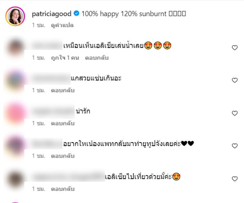 เรียกได้ว่า เป็นคุณแม่ที่มีความสวย ออร่ามากๆ ยิ่งเป็นคุณแม่ยิ่งสวยกว่าเดิม สําหรับ แพทริเซีย กู๊ด คุณแม่ของ น้องเอลิเซีย ที่ตอนนี้จ่ำม่ำมาก และเริ่มมีแฟนคลับเยอะขึ้นเรื่อยๆก็ว่าได้ ล่าสุดคุณแม่ลูกหนึ่ง แพทริเซีย มาอวดความแซ่บ หุ่นปังๆ โดยได้ระบุแคปชั่นว่า 100% happy 120% sunburnt มาลุคนุ่งบีกกินี่เล่นน้ำท้าแดดมาก