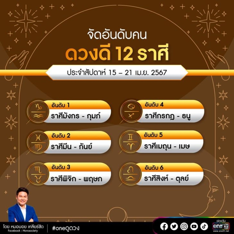 เมื่อวันที่ 17 เม.ย. 67 ที่ผ่านมา หมอบอย เคลียร์ชัด นักดูดวงและราศี เปิดดวงดวงชะตา การจัดอันดับ 12 ราศี ประจำสัปดาห์ 15 - 21 เมษายน 67 มาดูกันว่าราศีของคุณอยู่อันดับที่เท่าไหร่