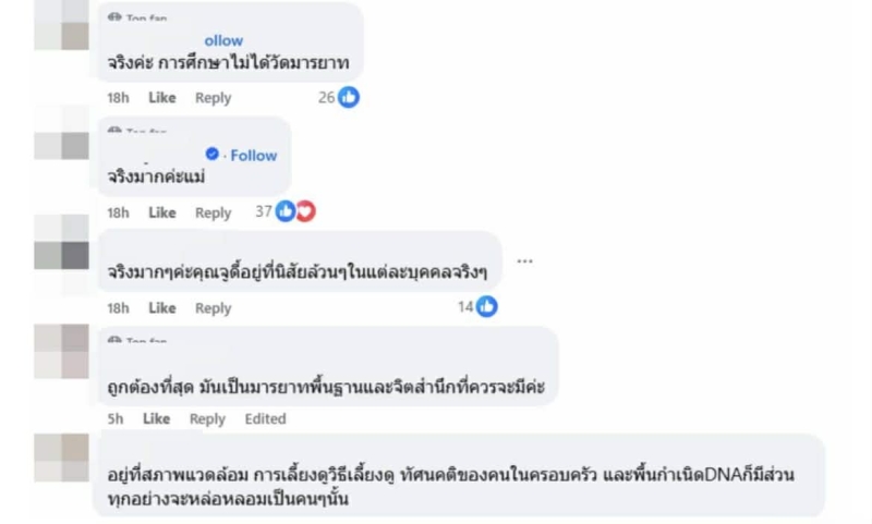 ความเห็นของเธอ ได้รับการสนับสนุนจากชาวเน็ตหลายคน ที่ย้ำว่า ความเป็นคนวัดกันที่การกระทำ ไม่ใช่ปริญญา หรือ วุฒิการศึกษา ใครที่เรียนสูงแต่ไม่รู้จักมารยาทก็สามารถทำพฤติกรรมไม่เหมาะสมได้ ขณะที่คนเรียนไม่สูง แต่ได้รับการปลูกฝังดี จะรู้จักกาลเทศะ และ ทำตัวเหมาะสมกับสังคมอย่างแท้จริง