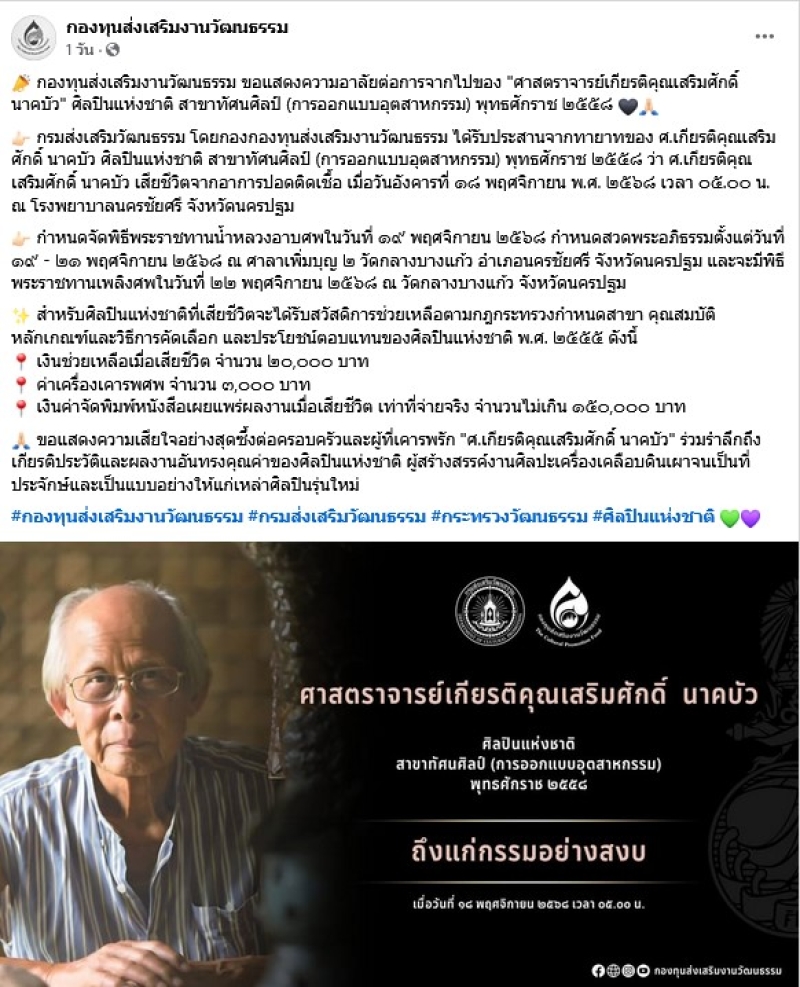 เมื่อวันที่ 20 พ.ย. 68 ทาง กองทุนส่งเสริมงานวัฒนธรรม ได้ออกมาเผยว่า กองทุนส่งเสริมงานวัฒนธรรม ขอแสดงความอาลัยต่อการจากไปของ "ศาสตราจารย์เกียรติคุณเสริมศักดิ์ นาคบัว" ศิลปินแห่งชาติ สาขาทัศนศิลป์ (การออกแบบอุตสาหกรรม) พุทธศักราช ๒๕๕๘