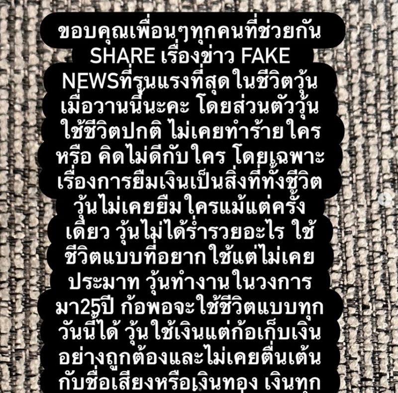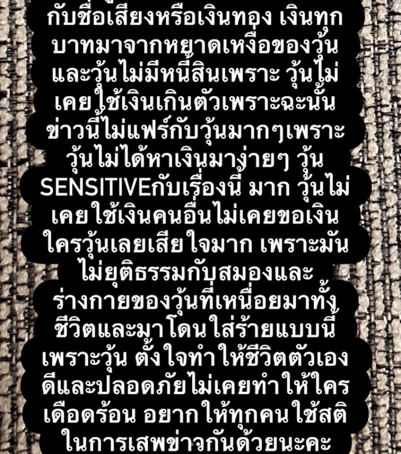 กับชื่อเสียงหรือเงินทอง เงินทุก บาทมาจากหยาดเหงื่อของวัน และวุ้นไม่มีหนี้สินเพราะวุ้นไม่ เคยใช้เงินเกินตัวเพราะฉะนั้น ข่าวนี้ไม่แฟร์กับวุ้นมากๆเพราะ วุ้นไม่ได้หาเงินมาง่ายๆ วัน SENSITIVEกับเรื่องนี้ มาก วุ้นไม่ เคยใช้เงินคนอื่นไม่เคยขอเงิน ใครวุ้นเลยเสียใจมาก เพราะมัน ไม่ยุติธรรมกับสมองและ ร่างกายของวันที่เหนื่อยมาทั้ง ชีวิตและมาโดนใส่ร้ายแบบนี้ เพราะวุ้น ตั้งใจทําให้ชีวิตตัวเอง ดีและปลอดภัยไม่เคยทําให้ใคร เดือดร้อน อยากให้ทุกคนใช้สติ ในการเสพข่าวกันด้วยนะคะ