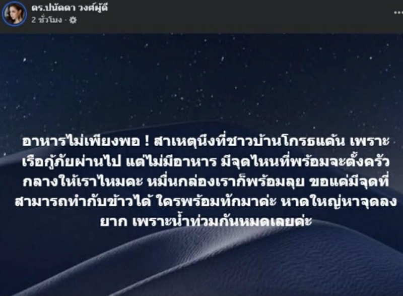โดย บุ๋ม ดร.ปนัดดา วงศ์ผู้ดี ระบุว่า หนึ่งในสาเหตุที่เกิดความไม่พอใจ คือ ปัญหาเรื่องอาหาร ขณะที่ทีมกู้ภัยเข้าช่วยเหลือ แต่ยังไม่มีจุดให้จัดเตรียมอาหารกลาง ทำให้ชาวบ้านบางส่วนรู้สึกขาดการดูแล