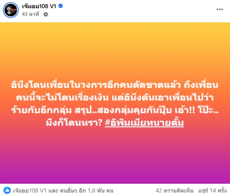 วงการบันเทิงยังมีเรื่องให้ติดตามอย่างต่อเนื่อง ล่าสุดเพจ เจ๊มอย 108 v1 โพสต์ข้อความปริศนา ทำเอาชาวโซเชียลเดากันไปต่าง ๆ นานา ว่า อินึง ที่กล่าวถึงคือใคร