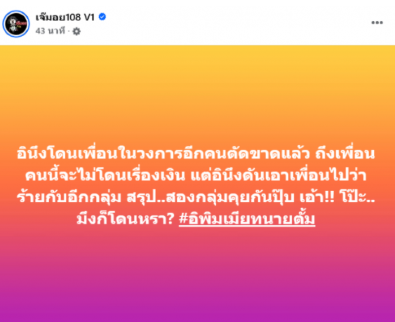 เรียกได้ว่า วงการบันเทิงยังคงเต็มไปด้วยดราม่า ล่าสุด เพจเจ๊มอย 108 ปล่อยข้อความปริศนา ทำให้แฟนๆ ต้องขุดข้อมูลเดาว่า คนที่ถูกกล่าวถึงคือใคร