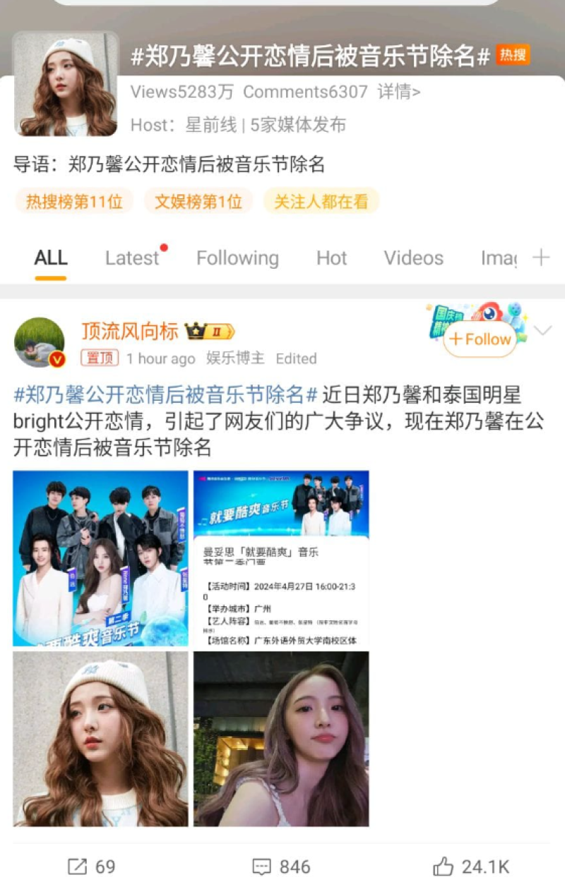 ล่าสุด ทางเพจดัง อย่าง ข่าวสารบันเทิงจีน ได้ออกมาเผยว่า ข่าวด่วน!! บล็อกเกอร์บันเทิงคนหนึ่งรายงานว่า เนเน่-เจิ้งหน่ายซิน 郑乃馨 ถูกถอดชื่อออกจากงานเทศกาลดนตรีที่จะจัดขึ้นหลายเมืองในจีน ซึ่งเดิมเนเน่มีคิวจะไปร่วมงานในวันที่ 27 เมษายนนี้ และมีข่าวอีกว่าเนเน่ยังถูกถอดชื่อออกจากชีรีส์ 破茧02 | Insect Detective ที่กำลังจะฉายทางช่อง youku ด้วยครับ