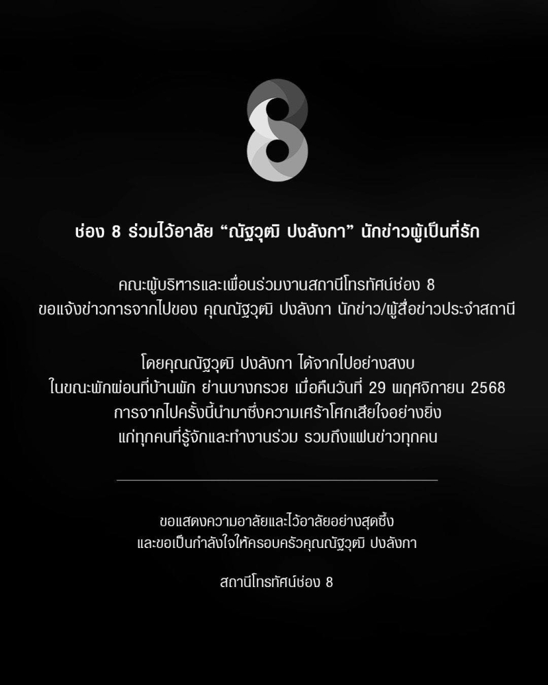 ช่อง 8 ร่วมไว้อาลัย ณัฐวุฒิ ปงลังกา นักข่าวผู้เป็นที่รัก คณะผู้บริหารและเพื่อนร่วมงานสถานีโทรทัศน์ช่อง 8 ขอแจ้งข่าวการจากไปของ คุณณัฐวุฒิ ปงลังกา นักข่าว/ผู้สื่อข่าวประจำสถานี โดยคุณณัฐวุฒิ ปงลังกา ได้จากไปอย่างสงบ