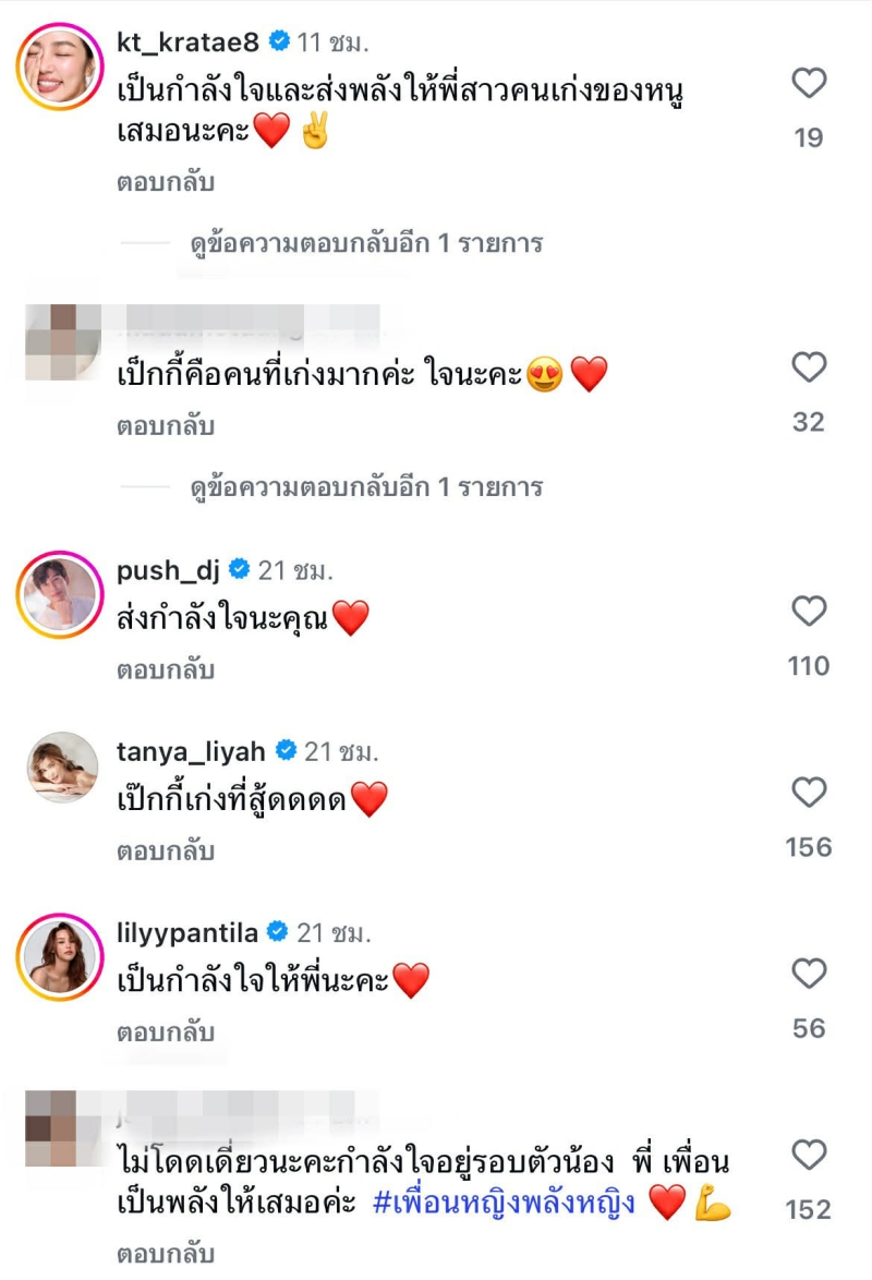 ดารา และ คนในแวดวงบันเทิงเองก็ไม่น้อยหน้า หลายคนเข้ามาร่วมส่งพลังใจให้เป็กกี้ อาทิ กระแต อาร์สยาม , ธัญญ่า ธัญญาเรศ , ดีเจพุฒ , นก จริยา , ลิลลี่ ภัณฑิลา , นิว นภัสสร และ ซี ศิวัฒน์ ต่างทิ้งข้อความขอให้ เธอ ผ่านช่วงเวลาหนักหนานี้ไปได้