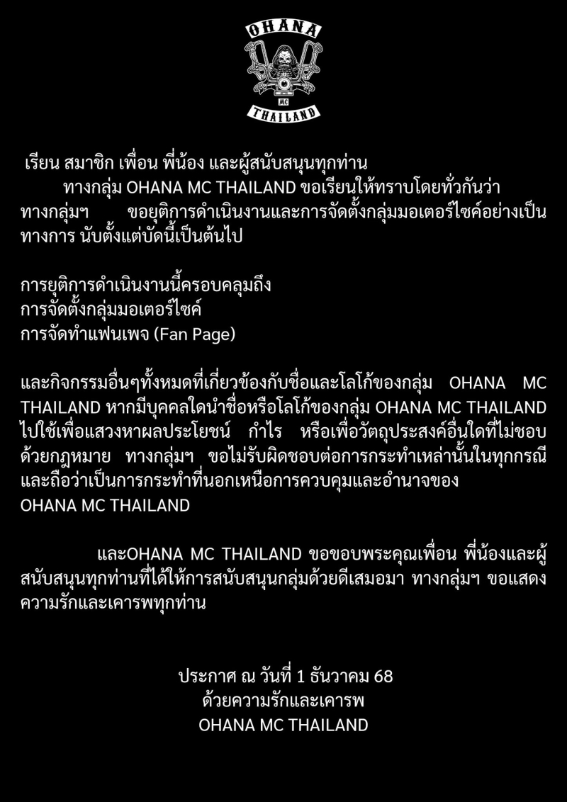ทางกลุ่มฯ ขอไม่รับผิดชอบต่อการกระทำเหล่านั้นในทุกกรณี และถือว่าเป็นการกระทำที่นอกเหนือการควบคุมและอำนาจของ OHANA MC THAILAND และOHANA MC THAILAND ขอขอบพระคุณเพื่อน พี่น้องและผู้สนับสนุนทุกท่านที่ได้ให้การสนับสนุนกลุ่มด้วยดีเสมอมา ทางกลุ่มฯ ขอแสดงความรักและเคารพทุกท่าน ประกาศ ณ วันที่ 1 ธันวาคม 68 ด้วยความรักและเคารพ OHANA MC THAILAND