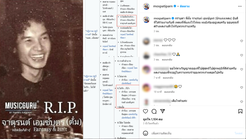 เรียกได้ว่า เป็นเรื่องเศร้าสำหรับวงการเพลง ล่าสุดทาง มอส ปฏิภาณ ได้โพสต์อาลัย นักแต่งเพลงชื่อดัง และอดีตมือกีต้าร์ ตั๋ม จาตุรนต์ เอมซ์บุตร พร้อมข้อความสุดอาลัยว่า กราบลา พี่ตั๋ม จาตุรนต์ เอมซ์บุตร (นักแต่งเพลง) ยินดีที่ได้ร่วมงานกับพี่ เพลงที่พี่แต่งไว้ให้ผม ผมยังร้องอยู่เลยครับ ขอบคุณที่สร้างผลงานดีๆให้กับพวกเรานะครับ