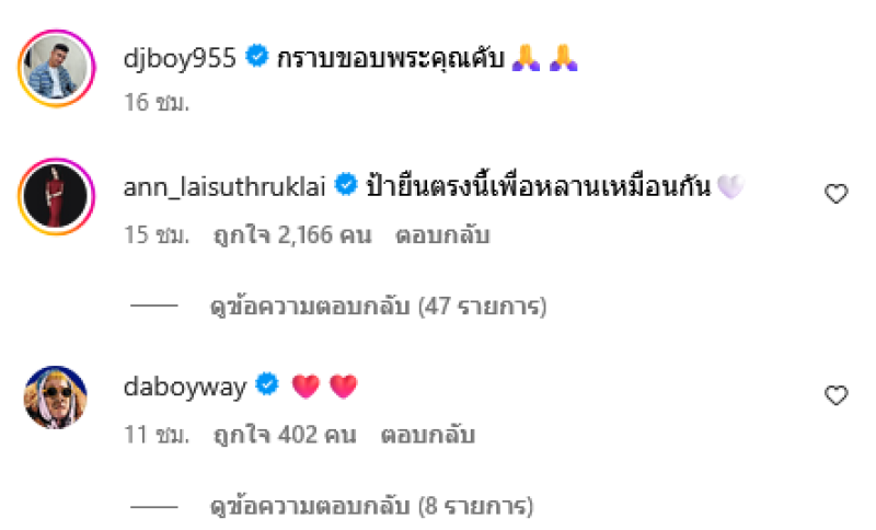 พร้อมเขียนแคปชั่นระบุว่า กราบขอบคุณครับ ทั้งนี้ เวย์ ไทเทเนี่ยม ก็ได้เข้ามาคอมเมนต์เป็นอีโมจิรูปหัวใจ 2 ดวงทันที