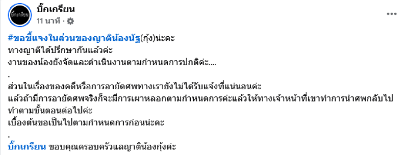 จากกรณีที่มีข่าวออกมาว่า ทางครอบครัว ณัฐวุฒิ ปงลังกา เห็นควรให้อายัดศพ น้องเอาไว้เพื่อตรวจสอบข้อเท็จจริง ล่าสุดเพจบิ๊กเกรียนได้ออกมาอัปเดตจากทางครอบครัวว่า ทางญาติได้ปรึกษากันแล้วค่ะ งานของน้องยังจัดและดำเนินงานตามกำหนดการปกติค่ะ