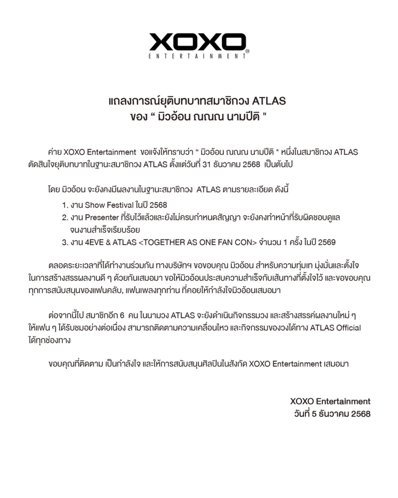 มิวอ้อนจะยุติบทบาทสมาชิกวง ATLAS ตั้งแต่วันที่ 31 ธันวาคม 2568 เป็นต้นไป แต่ยังคงทำงานที่รับไว้แล้วให้เสร็จสิ้น ได้แก่