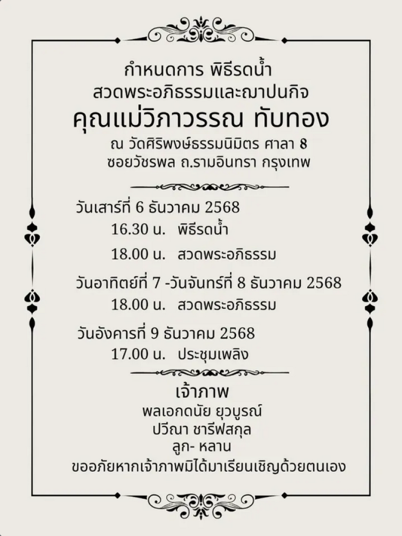 วันอาทิตย์ที่ 7-วันจันทร์ที่ 8 ธันวาคม 2568 18.00 น. สวดพระอภิธรรม