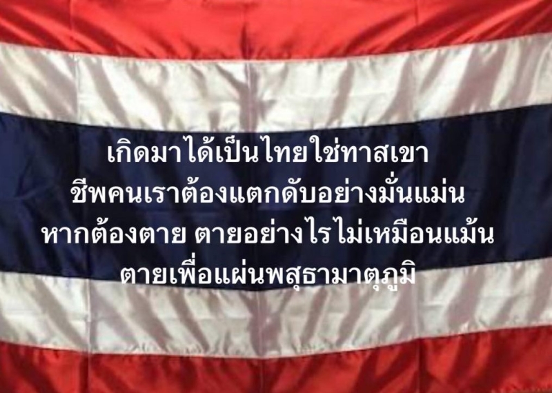 และข้อความในภาพว่า เกิดมาได้เป็นไทยใช่ทาสเขา ชีพคนเราต้องแตกดับอย่างมั่นแม่น หากต้องตาย ตายอย่างไรไม่เหมือนแม้น ตายเพื่อแผ่นพสุธามาตุภูมิ