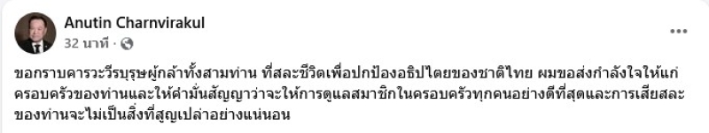 วันที่ 9 ธ.ค. 68 ทาง นายกรัฐมนตรีอนุทิน โพสต์ผ่านทาง Anutin Charnvirakul โดย ข้อความระบุว่า ขอกราบคารวะวีรบุรุษผู้กล้าทั้งสามท่าน ที่สละชีวิตเพื่อปกป้องอธิปไตยของชาติไทย ผมขอส่งกำลังใจให้แก่ครอบครัวของท่านและให้คำมั่นสัญญาว่าจะให้การดูแลสมาชิกในครอบครัวทุกคนอย่างดีที่สุดและการเสียสละของท่านจะไม่เป็นสิ่งที่สูญเปล่าอย่างแน่นอน