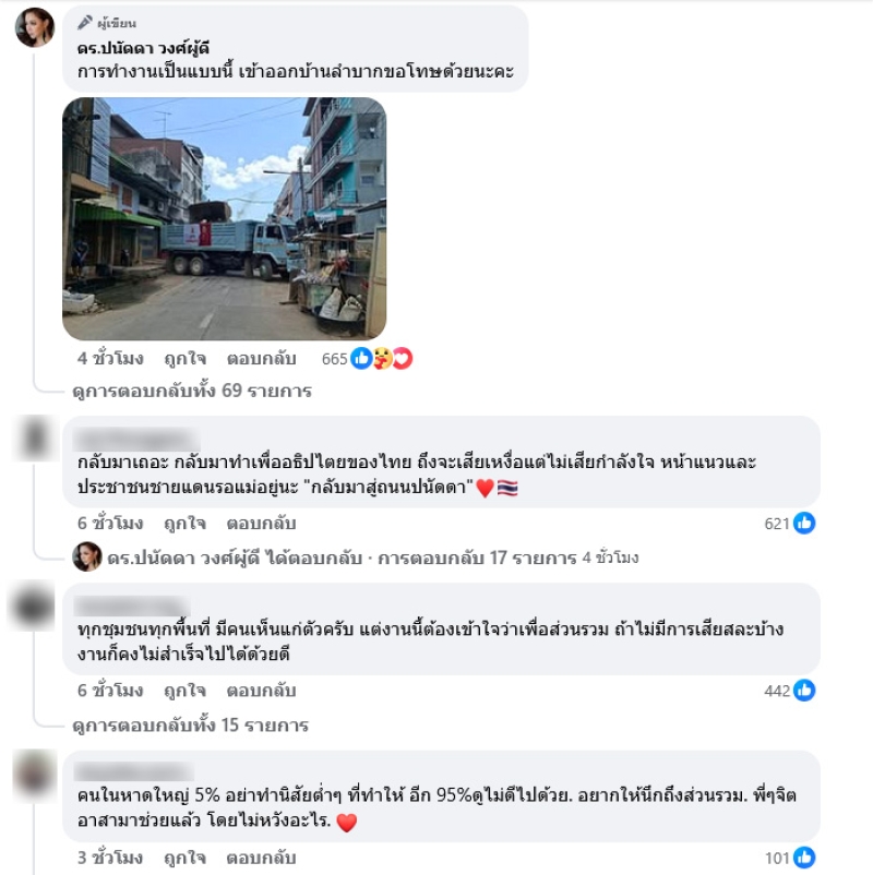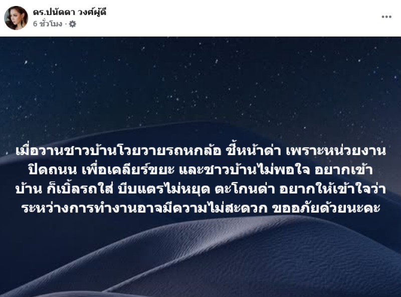โดยเขียนข้อความระบุว่า เมื่อวานชาวบ้านโวยวายรถหกล้อ ชี้หน้าด่า เพราะหน่วยงานปิดถนน เพื่อเคลียร์ขยะ และชาวบ้านไม่พอใจ อยากเข้าบ้าน ก็เบิ้ลรถใส่ บีบแตรไม่หยุด ตะโกนด่า อยากให้เข้าใจว่า ระหว่างการทำงานอาจมีความไม่สะดวก ขออภัยด้วยนะคะ