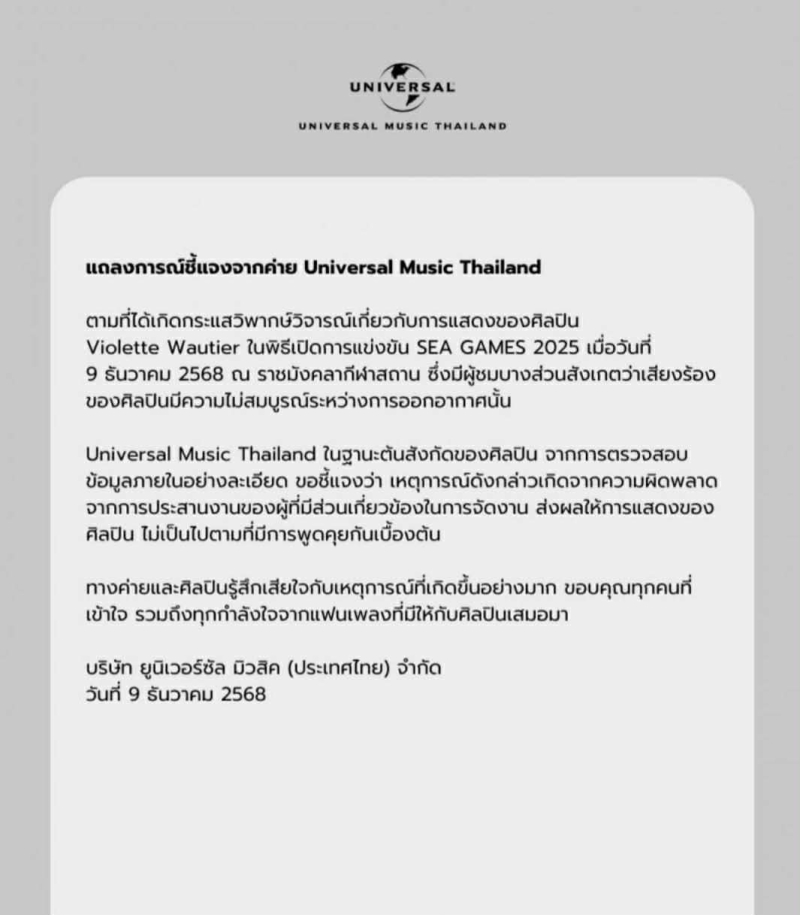 ต่อมา Universal Music Thailand ต้นสังกัดของศิลปิน ออกแถลงการณ์ยืนยันว่า เหตุการณ์ที่เกิดขึ้นเป็นความผิดพลาดจากการประสานงานของผู้จัดงาน ส่งผลให้การแสดงไม่เป็นไปตามที่ตกลงไว้ และขอโทษแฟนเพลงทุกคนที่ได้รับผลกระทบ