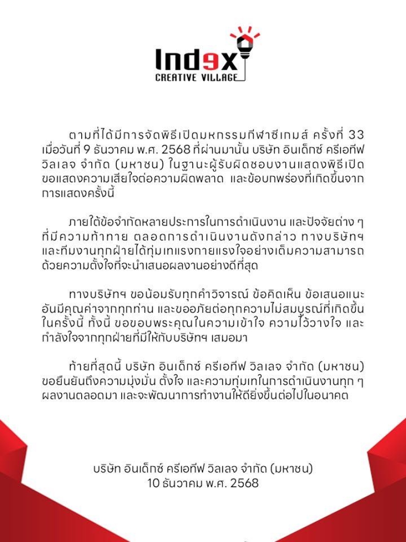 ตามที่ได้มีการจัดพิธีเปิดมหกรรมกีฬาซีเกมส์ ครั้งที่ 33 เมื่อวันที่ 9 ธันวาคม พ.ศ. 2568 ที่ผ่านมานั้น บริษัท อินเด็กซ์ ครีเอทีฟ วิลเลจ จำกัด (มหาชน) ในฐานะผู้รับผิดชอบงานแสดงพิธีเปิด ขอแสดงความเสียใจต่อความผิดพลาด และข้อบกพร่องที่เกิดขึ้นจากการแสดงครั้งนี้ ภายใต้ข้อจำกัดหลายประการในการดำเนินงาน และปัจจัยต่างๆ ที่มีความท้าทาย ตลอดการดำเนินงานดังกล่าว