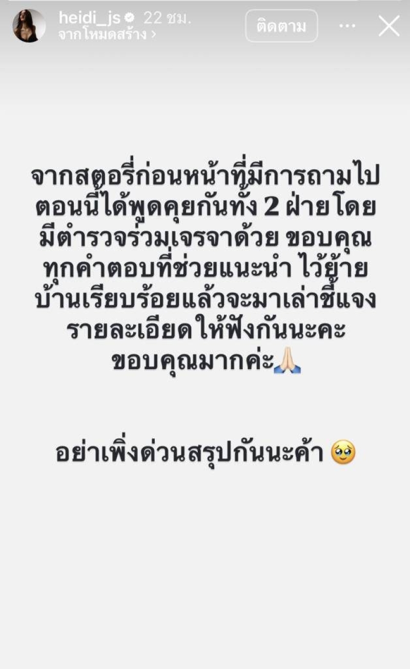 จากสตอรี่ก่อนหน้าที่มีการถามไป มีตำรวจร่วมเจรจาด้วย ขอบคุณทุกคำตอบที่ช่วยแนะนำ ไว้ย้ายบ้านเรียบร้อยแล้ว จะมาเล่าชี้แจงรายละเอียดให้ฟังกันนะคะ ขอบคุณมากค่ะ อย่าเพิ่งด่วนสรุปกันนะค้า