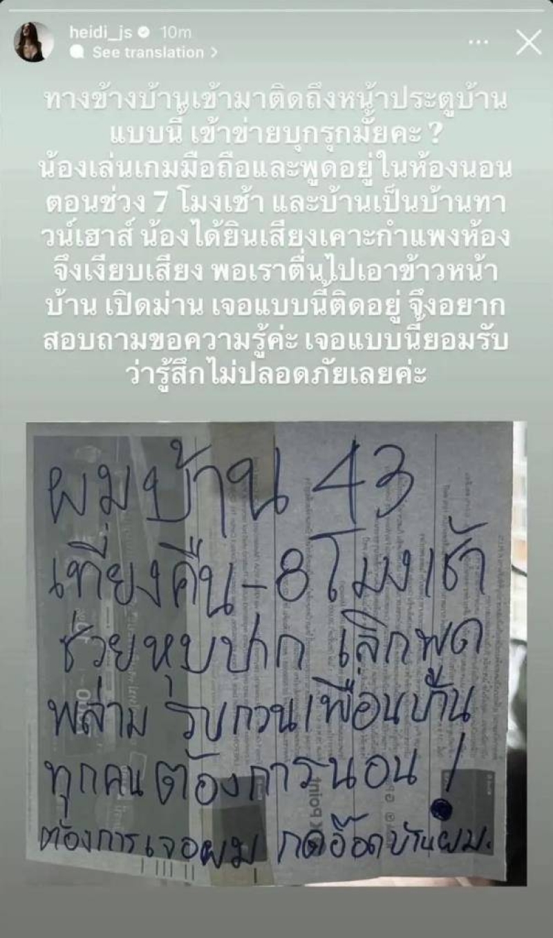 โดย ไฮดี้ ได้เขียนโพสต์ว่า ทางข้างบ้านเข้ามาติดถึงหน้าประตูบ้านแบบนี้ เข้าข่ายบุกรุกมั้ยคะ? น้องเล่นเกมมือถือและพูดอยู่ในห้องนอน ตอนช่วง 7 โมงเช้า และบ้านเป็นบ้านทาวน์เฮาส์ น้องได้ยินเสียงเคาะกำแพงห้อง จึงเงียบเสียง พอเราตื่นไปเอาข้าวหน้าบ้าน เปิดม่าน เจอแบบนี้ติดอยู่ จึงอยากสอบถาม ขอความรู้ค่ะ เจอแบบนี้ยอมรับว่ารู้สึกไม่ปลอดภัยเลยค่ะ
