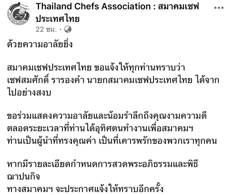 เรียกได้ว่า ข่าวการสูญเสียครั้งนี้ สร้างความเศร้าให้กับแวดวงอาหารไทยอย่างมาก หลังสมาคมเชฟประเทศไทย ออกมายืนยันการจากไปของ เชฟสมศักดิ์ รารองคำ บุคคลสำคัญผู้เป็นนายกสมาคมฯ