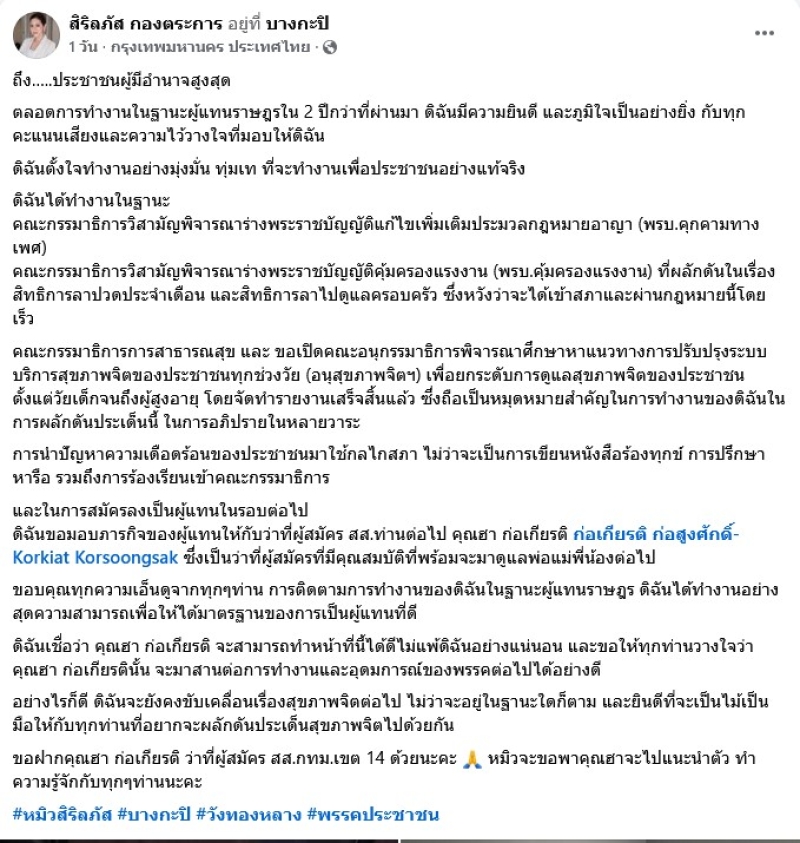 เรียกได้ว่า เป็นดารานักแสดงที่ผันตัวไปเล่นการเมือง อย่าง หมิว สิริลภัส กองตระการ ที่ทำงานในฐานะสมาชิกสภาผู้แทนราษฎร (สส.) กรุงเทพมหานคร สังกัดพรรคประชาชน มา เป็นระยะเวลากว่า 2 ปี ล่าสุด ได้ออกมาโพสต์ข้อความผ่านอินสตา แกรมส่วนตัวอย่างเป็นทางการ เพื่ออำลาตำแหน่งและส่งไม้ต่อภารกิจให้กับว่าที่ผู้สมัครคนใหม่ โดยเผยว่า ถึง…..ประชาชนผู้มีอำนาจสูงสุด ตลอดการทำงานในฐานะผู้แทนราษฎรใน 2 ปีกว่าที่ผ่านมา ดิฉันมีความยินดี และภูมิใจเป็นอย่างยิ่ง กับทุกคะแนนเสียงและความไว้วางใจที่มอบให้ดิฉัน