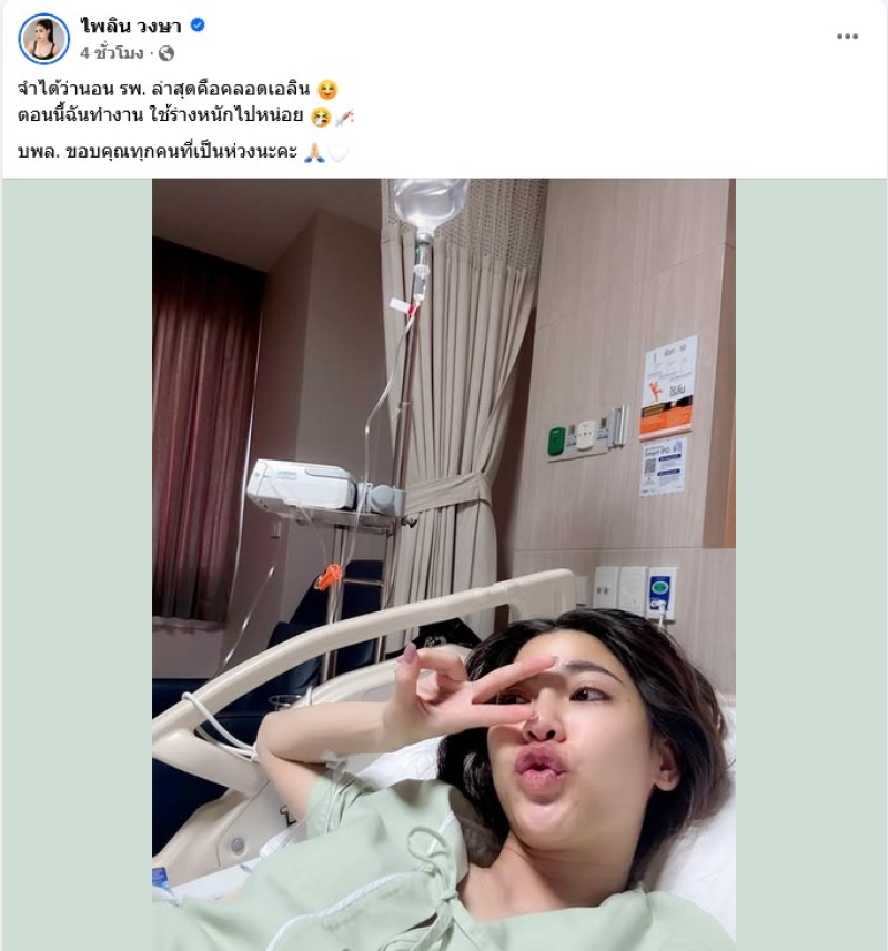 และอีกโพสต์ จำได้ว่านอน รพ. ล่าสุดคือคลอดเอลิน ตอนนี้ฉันทำงาน ใช้ร่างหนักไปหน่อย บพล. ขอบคุณทุกคนที่เป็นห่วงนะคะ