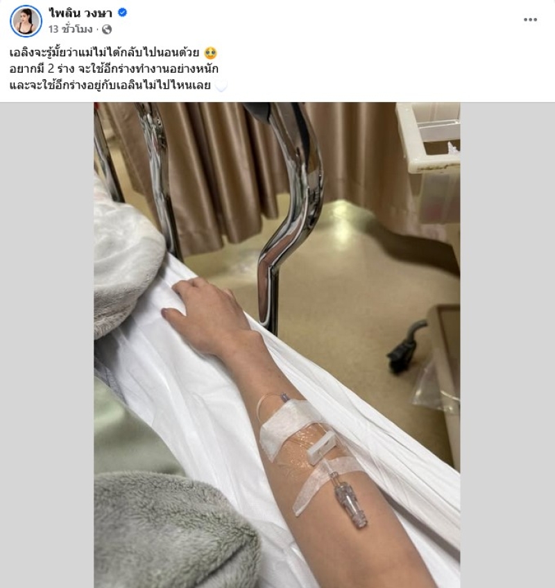 เรียกได้ว่า เป็นักร้องสาวเสียงดี อย่าง แบม ไพลิน วงษา ที่ไม่ว่าจะทำอะไรเจ้าตัวก็มักจะถูกดราม่าอยู่บ่อยๆ ล่าสุด เจ้าตัวได้แอดมิท โรงพยาบาลกะทันหัน โดยได้โพสต์ว่า เอลิงจะรู้มั้ยว่าแม่ไม่ได้กลับไปนอนด้วย อยากมี 2 ร่าง จะใช้อีกร่างทำงานอย่างหนัก และจะใช้อีกร่างอยู่กับเอลินไม่ไปไหนเลย