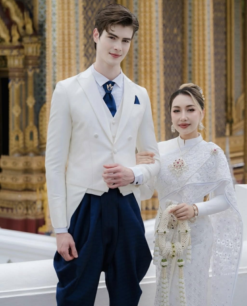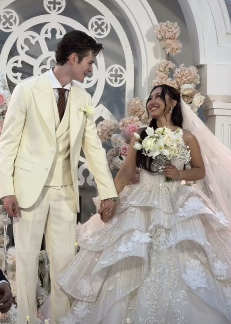ขณะที่ฝั่งเจ้าสาว พู่กัน ก็เปล่งประกายในลุคแสนสง่า ชุดแต่งงานช่วยขับออร่าให้ดูโดดเด่น ยืนเคียงคู่กันแล้วเคมีเข้ากันอย่างลงตัว