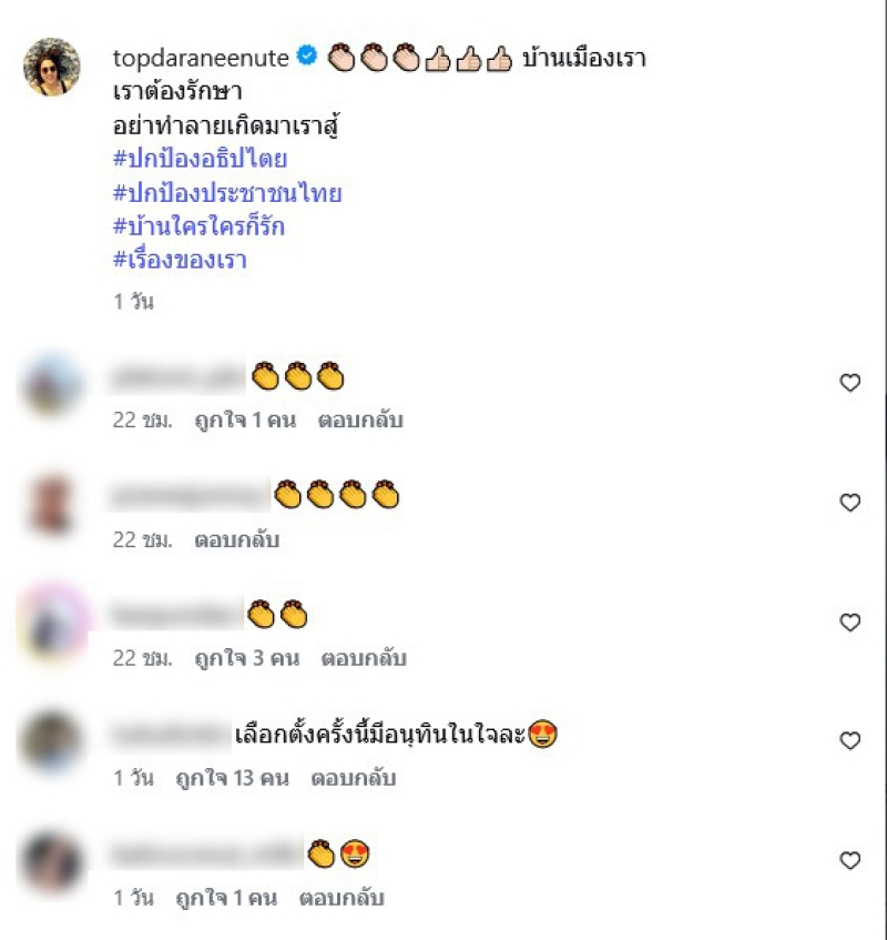 และทาง ท็อป ก็ได้เขียนว่า (อิโมจิปรบมือ)บ้านเมืองเรา เราต้องรักษา อย่าทำลายเกิดมาเราสู้