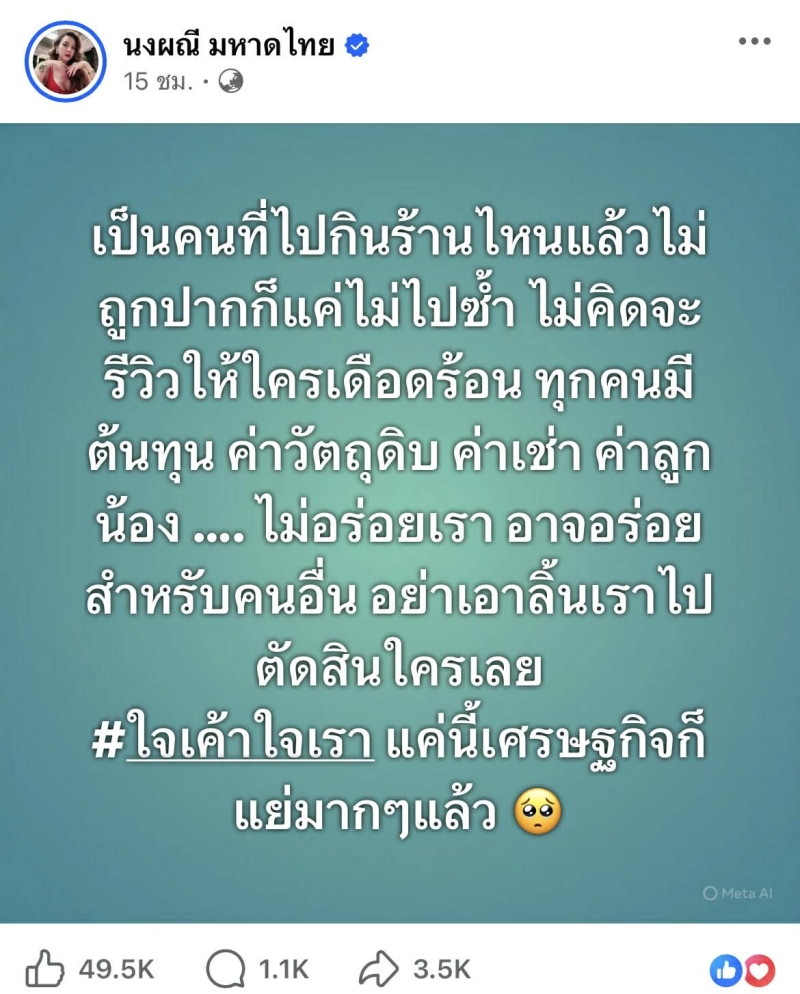 โดย เธอ ชี้ว่า รสนิยมการกินเป็นเรื่องส่วนบุคคล หากร้านไหนไม่ถูกปาก ก็เพียงเลือกไม่กลับไปซ้ำ ไม่จำเป็นต้องโพสต์โจมตี หรือ ทำให้เจ้าของร้านเดือดร้อน เพราะแต่ละร้านต้องแบกรับต้นทุนจำนวนมากในแต่ละวัน
