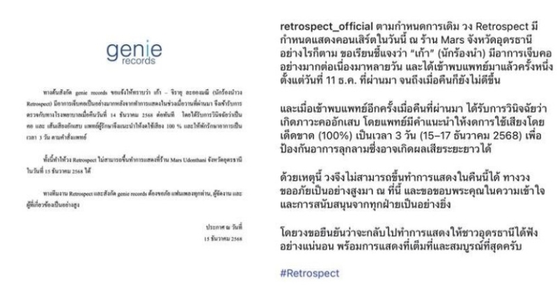 ด้วยเหตุนี้ วงจึงไม่สามารถขึ้นทำการแสดงในคืนนี้ได้ ทางวงขออภัยเป็นอย่างสูงมา ณ ที่นี้ และขอขอบพระคุณในความเข้าใจและการสนับสนุนจากทุกฝ่ายเป็นอย่างยิ่ง โดยวงขอยืนยันว่าจะกลับไปทำการแสดงให้ชาวอุดรธานีได้ฟังอย่างแน่นอน พร้อมการแสดงที่เต็มที่และสมบูรณ์ที่สุดครับ #Retrospect”