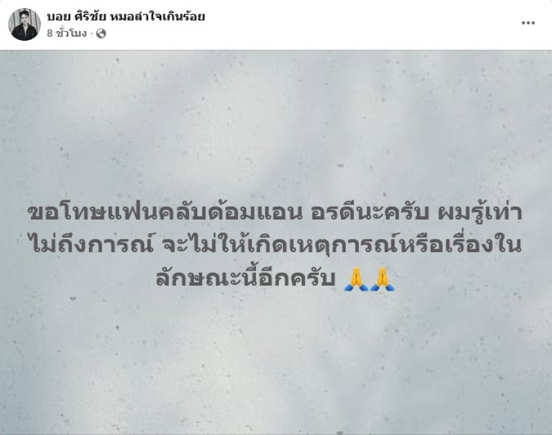 เรียกได้ว่า เป็นคู่รักหมอลำ ที่มีแฟนๆติดตามเพียบ อย่าง บอย ศิริชัย หมอลำใจเกินร้อย และ แอน อรดี ที่ล่าสุดทำเอาแฟนคลับ งง หนักมาก เมื่อทางบอย ศิริชัย ได้ออกมาโพสต์ว่า ขอโทษแฟนคลับด้อมแอน อรดีนะครับ ผมรู้เท่าไม่ถึงการณ์ จะไม่ให้เกิดเหตุการณ์หรือเรื่องในลักษณะนี้อีกครับ และยังคอมเมนต์ใต้โพสต์เพิ่มอีกว่า ผมโอเครเด้อครับ บ่มักยากครับ สบายๆ