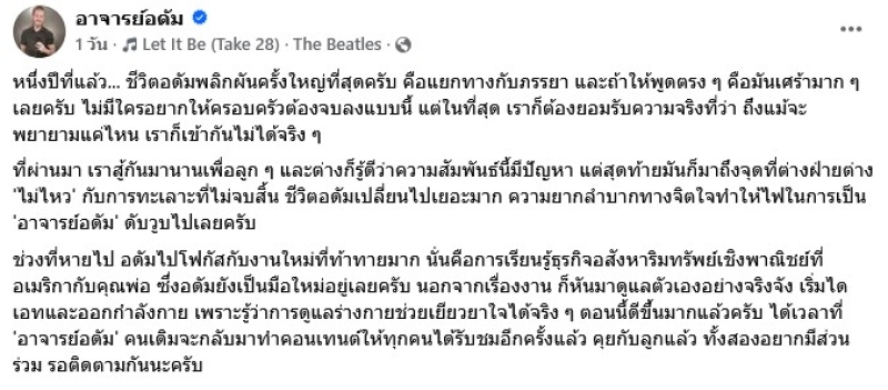 วันที่ 17 ธ.ค. 68 ทาง อาจารย์อดัม หรือ อดัม แบรด ชอว์ ครูสอนภาษาอังกฤษชื่อดังขวัญใจคนไทย โพสต์ข้อความผ่าน เฟซบุ๊กส่วนตัว เปิดเผยเรื่องราวชีวิตส่วนตัวที่พลิกผันครั้งใหญ่ที่สุด แยกทางกับภรรยามาเป็นเวลา 1 ปีแล้ว