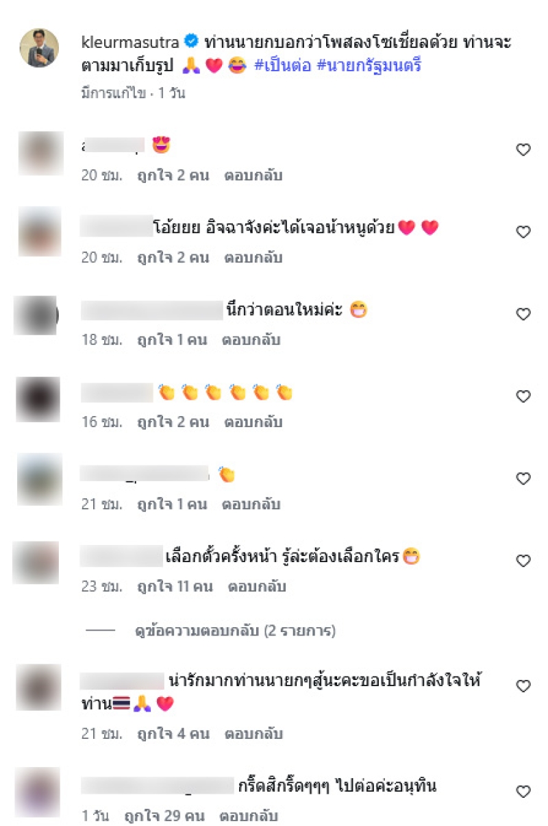 ชวนสงสัยโดยเฉพาะการใส่แฮชแท็ก #เป็นต่อ ต่อท้ายชื่อตำแหน่งนายกรัฐมนตรี แห่ตีความคอมเมนต์ใต้โพสต์ไปในทิศทางเดียวกัน อาทิ สมัยหน้าหนูเป็น (นายกฯ ) ต่อไม่รอแล้ว, หนู เป็นต่อ (เป็นนายกฯ ต่อ)
