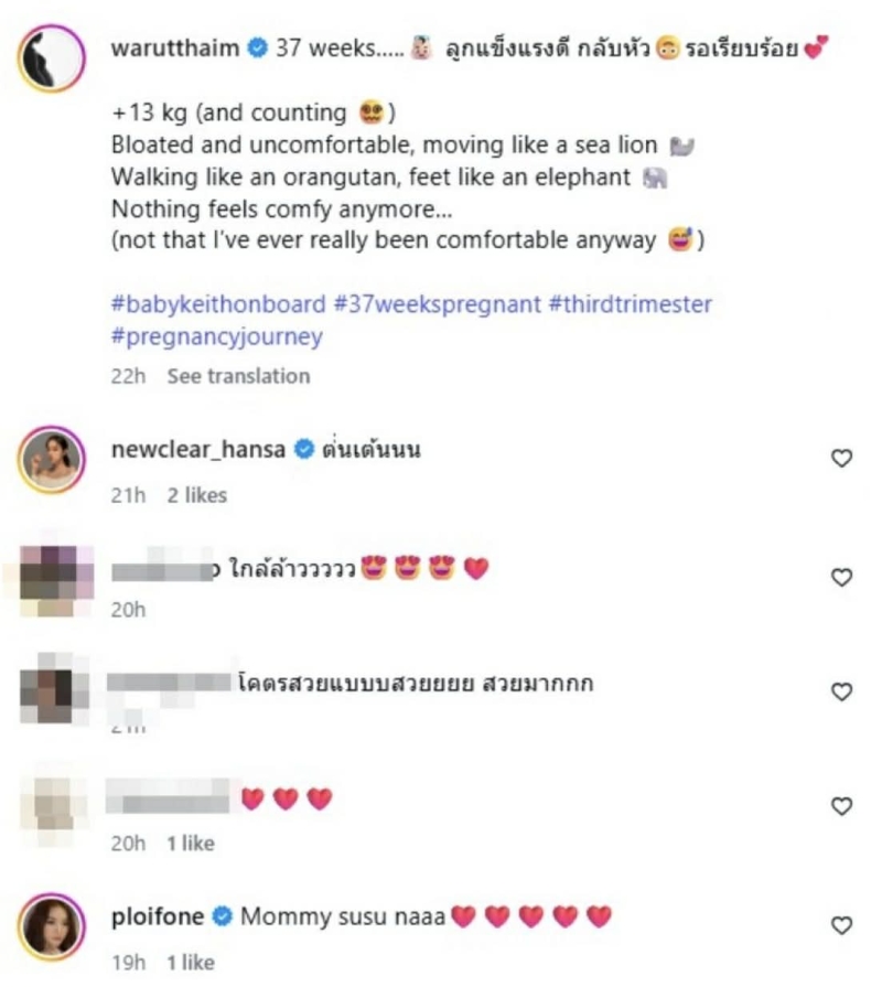 โดย เจ้าตัว เล่าด้วยอารมณ์ขันว่า ตอนนี้อายุครรภ์เข้าสู่สัปดาห์ที่ 37 แล้ว น้ำหนักตัวเพิ่มขึ้นกว่า 13 กิโลกรัม ร่างกายเริ่มไม่คล่องตัว แต่เต็มไปด้วยความสุขของการเป็นแม่