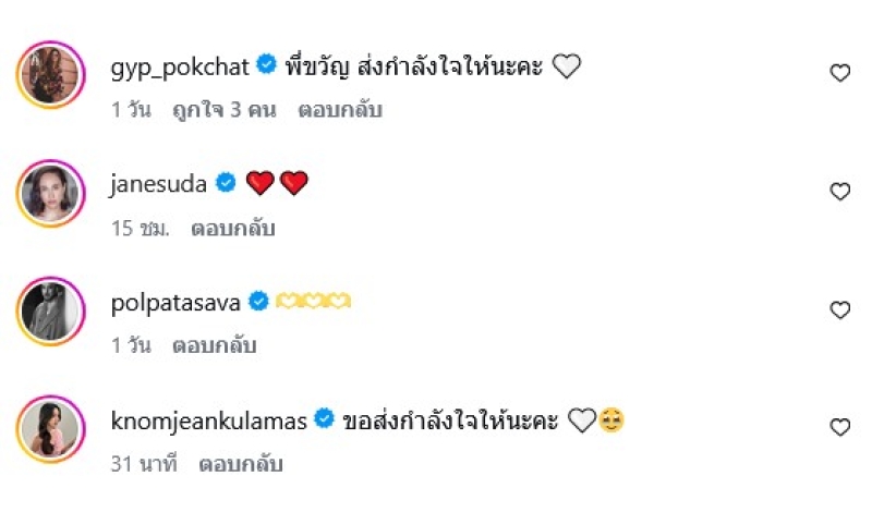 ท่ามกลางคนในวงการก็เข้ามาส่งกำลังใจ และทาง เจนสุดา ปานโต ก็ได้เข้ามาคอมเมนต์อิโมจิหัวใจสีแดงให้ด้วย