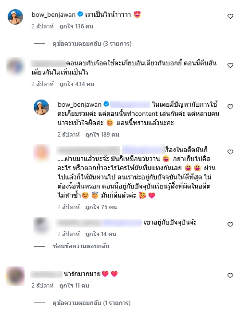 ตอนคบกับก๊อตใช้ตะเกียบอันเดียวกันบอกยี้ ตอนนี้คีบอันเดียวกันไม่เห็นเป็นไร โดยทางด้าน โบว์ รีบตอบกลับทันทีว่า ไม่เคยมีปัญหากับการใช้ตะเกียบร่วมค่ะ แค่ตอนนั้นทำcontent เล่นกันค่ะ แต่หลายคนน่าจะเข้าใจผิดค่ะ ตอนนี้ทราบแล้วนะคะ