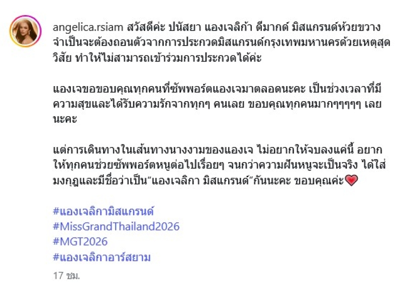 แต่การเดินทางในเส้นทางนางงามของแองเจ ไม่อยากให้จบลงแค่นี้ อยากให้ทุกคนช่วยซัพพอร์ตหนูต่อไปเรื่อยๆ จนกว่าความฝันหนูจะเป็นจริง ได้ใส่มงกุฎและมีชื่อว่าเป็น“แองเจลิกา มิสแกรนด์”กันนะคะ ขอบคุณค่ะ
