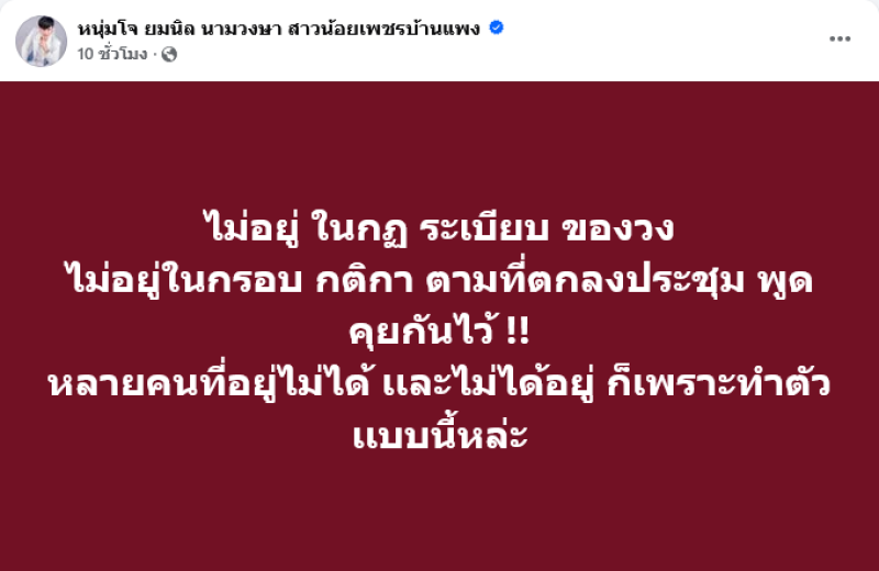 กลายเป็นประเด็นร้อนระอุบนโลกโซเชียลกลางดึกที่ผ่านมา เมื่อ หนุ่มโจ ยมนิล หรือ บอสโจ ผู้บริหารหนุ่มไฟแรงแห่งวง สาวน้อยเพชรบ้านแพง ได้ออกมาโพสต์ข้อความด้วยถ้อยคำที่ดุเดือดระบุว่า