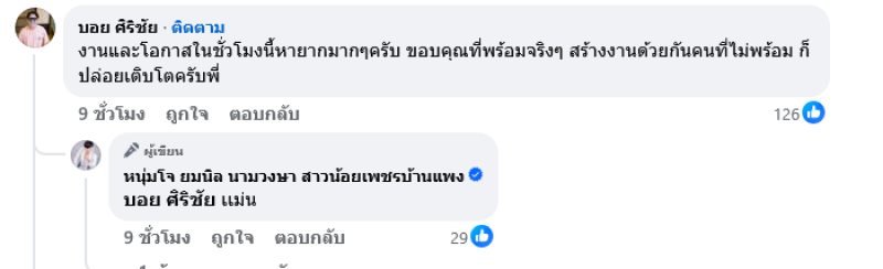 ไม่อยู่ ในกฏ ระเบียบ ของวง ไม่อยู่ในกรอบ กติกา ตามที่ตกลงประชุม พูดคุยกันไว้ !! หลายคนที่อยู่ไม่ได้ เเละไม่ได้อยู่ ก็เพราะทำตัวเเบบนี้หล่ะ โดยทางด้าน บอย ศิริชัย ได้ร่วมคอมเมนต์ว่า งานและโอกาสในชั่วโมงนี้หายากมากๆครับ ขอบคุณที่พร้อมจริงๆ สร้างงานด้วยกันคนที่ไม่พร้อม ก็ปล่อยเติบโตครับพี่