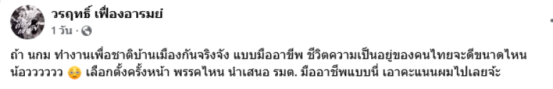 พร้อมเขียนแคปชั่นว่า ถ้านักการเมือง ทำงานเพื่อชาติบ้านเมืองกันจริงจัง แบบมืออาชีพ ชีวิตความเป็นอยู่ของคนไทยจะดีขนาดไหน น้อวววววว เลือกตั้งครั้งหน้า พรรคไหน นำเสนอ รมต. มืออาชีพแบบนี้ เอาคะแนนผมไปเลยจ้ะ