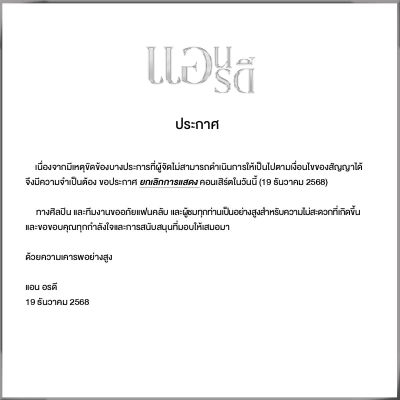 ประกาศ เนื่องจากมีเหตุขัดข้องบางประการที่ผู้จัดไม่สามารถดำเนินการให้เป็นไปตามเงื่อนไขของสัญญาได้ จึงมีความจำเป็นต้อง ขอประกาศ ยกเลิกการแสดง คอนเสิร์ตในวันนี้ (19 ธันวาคม 2568) ทางศิลปิน และทีมงานขออภัยแฟนคลับ และผู้ชมทุกท่านเป็นอย่างสูงสำหรับความไม่สะดวกที่เกิดขึ้น และขอขอบคุณทุกกำลังใจและการสนับสนุนที่มอบให้เสมอมา ด้วยความเคารพอย่างสูง แอน อรดี 19 ธันวาคม 2568