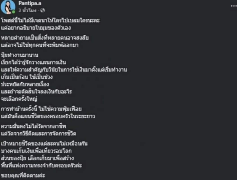ด้าน ปุ้มปุ้ย ออกมาชี้แจงด้วยท่าทีใจเย็น ระบุว่า ตั้งใจอธิบายเพื่อให้เข้าใจมุมมองของตัวเองมากกว่าโต้เถียง ย้ำว่า ทำงานมาอย่างต่อเนื่อง รู้จักวางแผนการเงิน คุมรายจ่าย และเลือกลงทุนกับเป้าหมายสำคัญของชีวิต