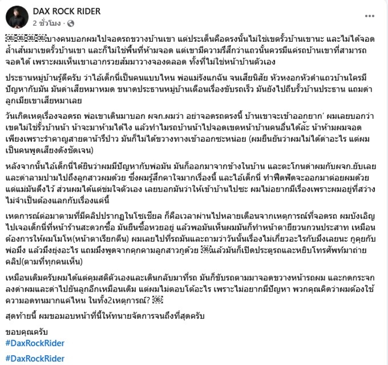 เรียกได้ว่า กำลังเป็นเป็นประเด็นเดือนในโลกโซเชียล เกี่ยวกับ แด๊กซ์ ร็อกไรเดอร์ หลังมีคนอ้างว่าถูกนักร้องดังทำร้าย และทะเลาะกัน ล่าสุด ทาง แด๊กซ์ ได้ออกมาชี้แจงแล้วว่า บางคนบอกผมไปจอดรถขวางบ้านเขา แต่ประเด็นคือตรงนั้นไม่ใช่เขตรั้วบ้านเขานะ และไม่ได้จอดล้ำเส้นมาเขตรั้วบ้านเขา และก็ไม่ใช่พื้นที่ห้ามจอด แต่เขามีความรึสึกว่าแถวนั้นควรมีแค่รถบ้านเขาที่สามารถจอดได้ เพราะผมเห็นเขาเอากรวยส้มมาวางจองตลอด ทั้งที่ไม่ใช่หน้าบ้านตัวเอง