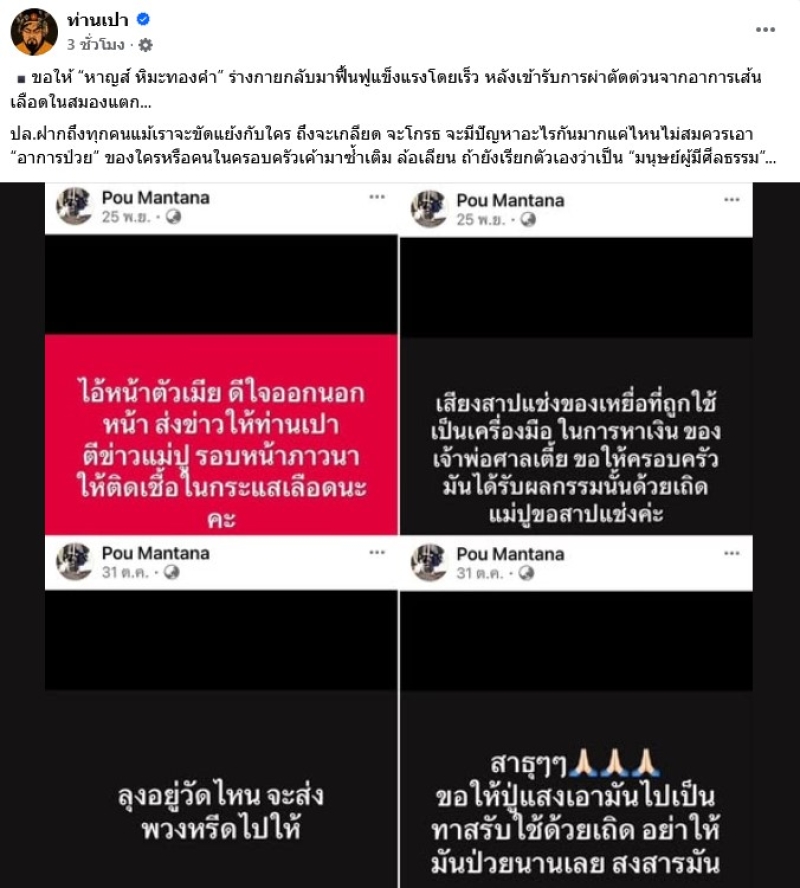 เรียกได้ว่า เจอมรสุมมาหนักมา เมื่อล่าสุด ทางเพจดัง อย่าง ท่านเปา ได้ออกมาโพสต์ว่า ขอให้ “หาญส์ หิมะทองคำ” ร่างกายกลับมาฟื้นฟูแข็งแรงโดยเร็ว หลังเข้ารับการผ่าตัดด่วนจากอาการเส้นเลือดในสมองแตก...